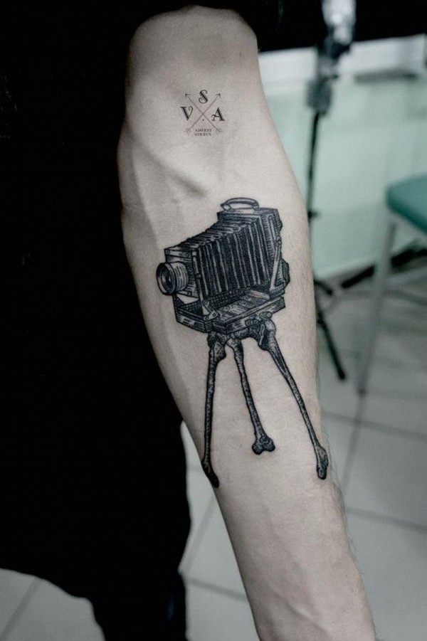 手臂逼真的黑色复古相机纹身图案