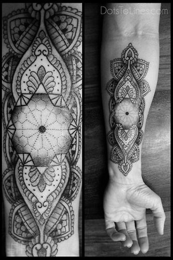 手臂好看的黑白印度风格梵花纹身图案