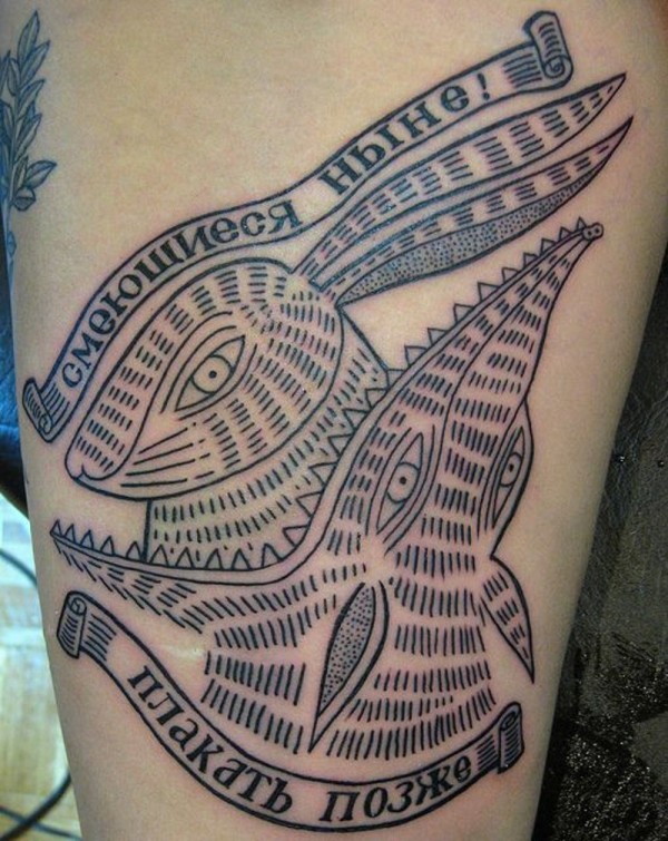 手臂黑色线条狐狸与兔子和字母纹身图案