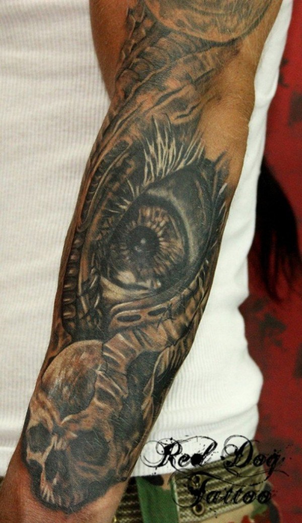 手臂非常逼真的神秘眼睛与骷髅纹身图案