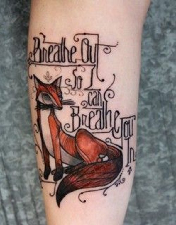 手臂彩色的小狐狸与字母纹身图案