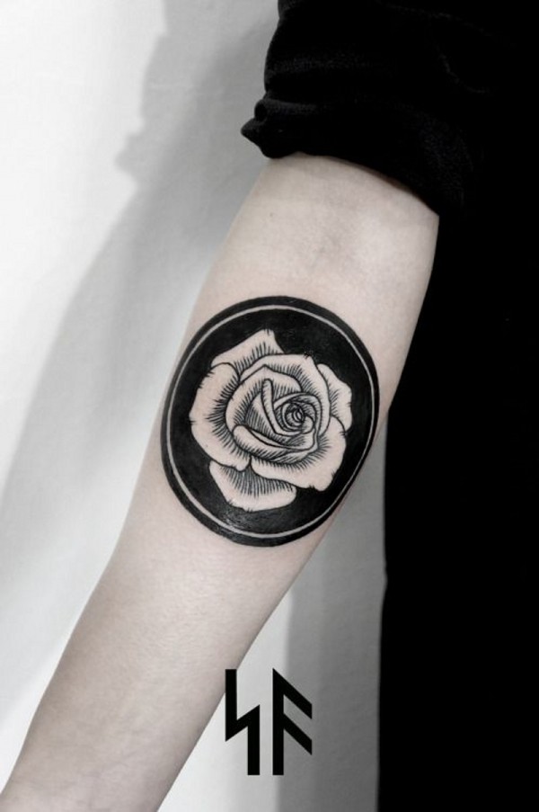 简单的小玫瑰和黑色圆圈手臂纹身图案