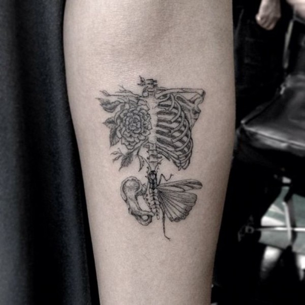 手臂黑色的人体骨架和蝴蝶花朵纹身图案