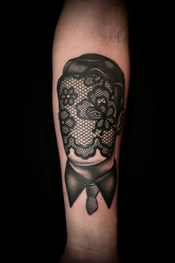 手臂时尚风格的黑白蕾丝男性脸纹身图案