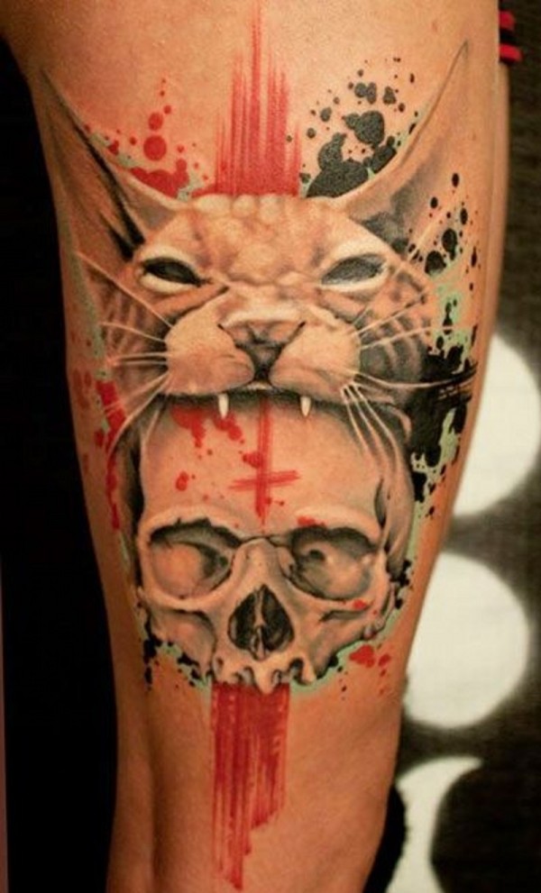 手臂令人毛骨悚然的血腥猫头与骷髅纹身图案
