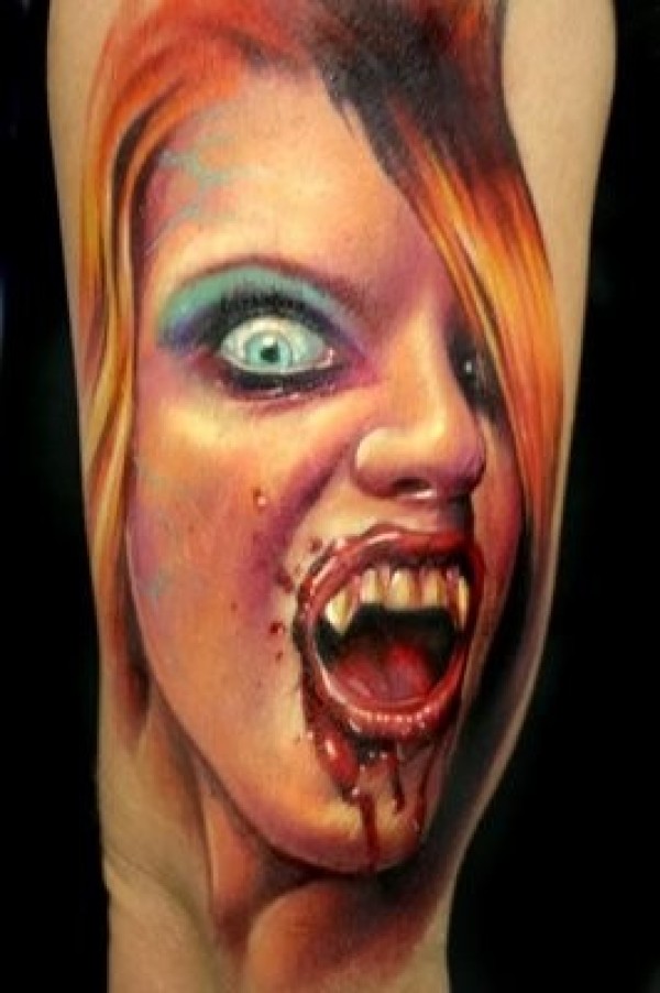手臂逼真的彩绘血腥女吸血鬼纹身图案