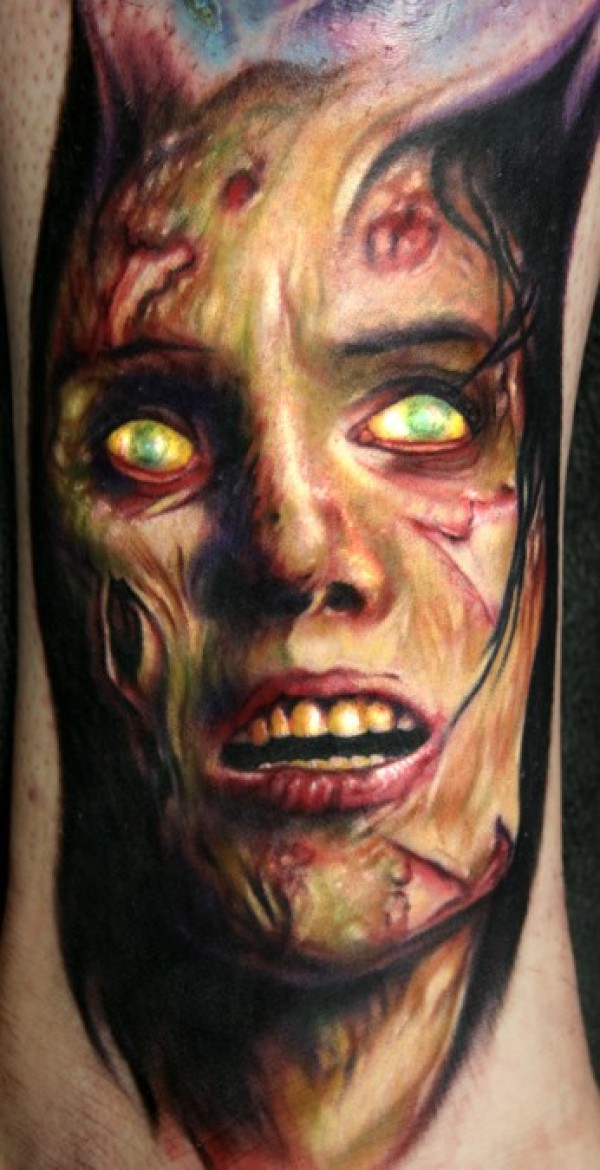 非常逼真的彩色怪物肖像手臂纹身图案