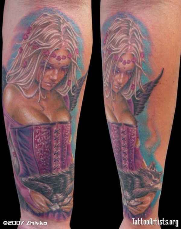 手臂逼真的五彩诱人女郎和猫咪纹身图案