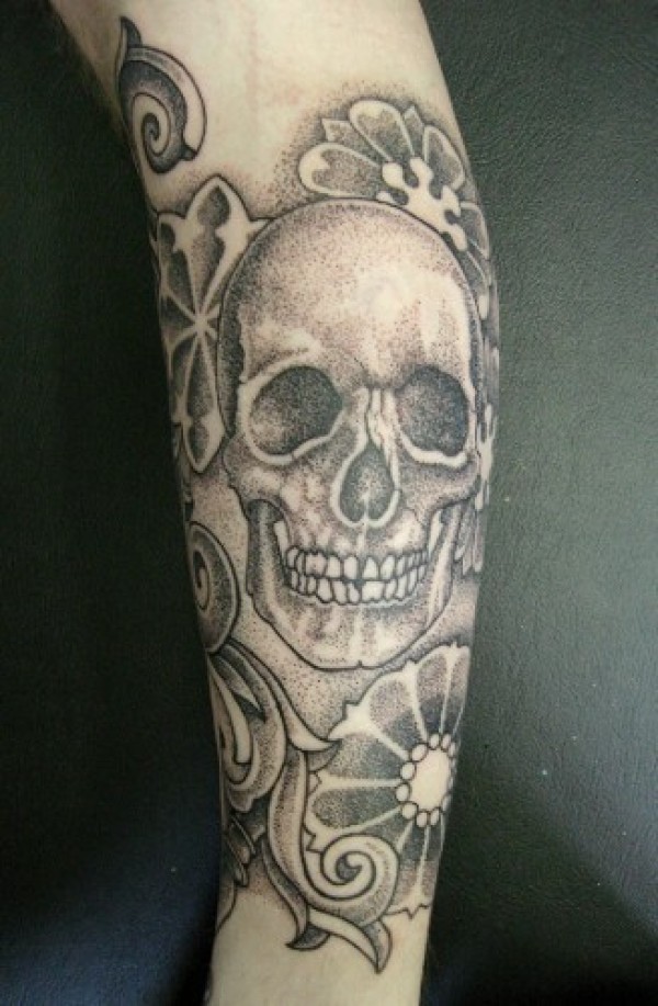 手臂骷髅与花卉灰色纹身图案