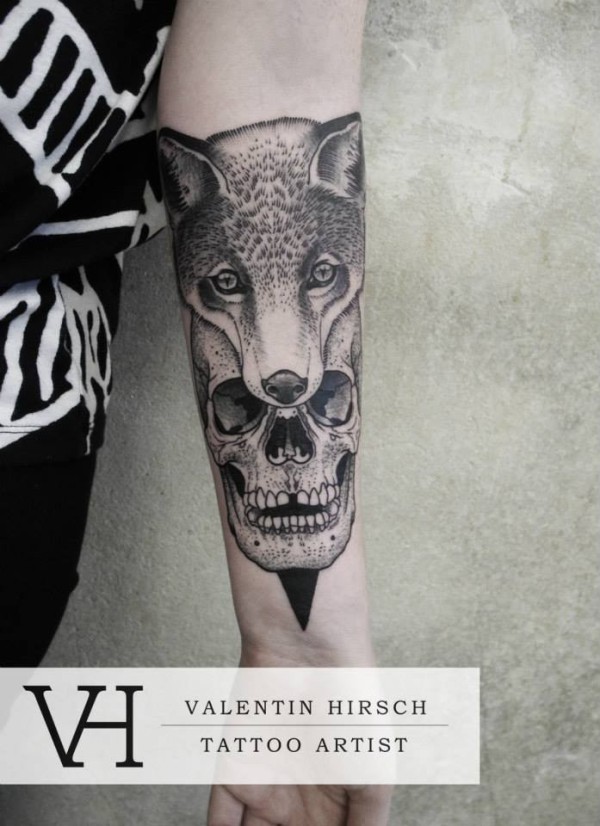 狐狸头和骷髅黑灰点刺手臂纹身图案