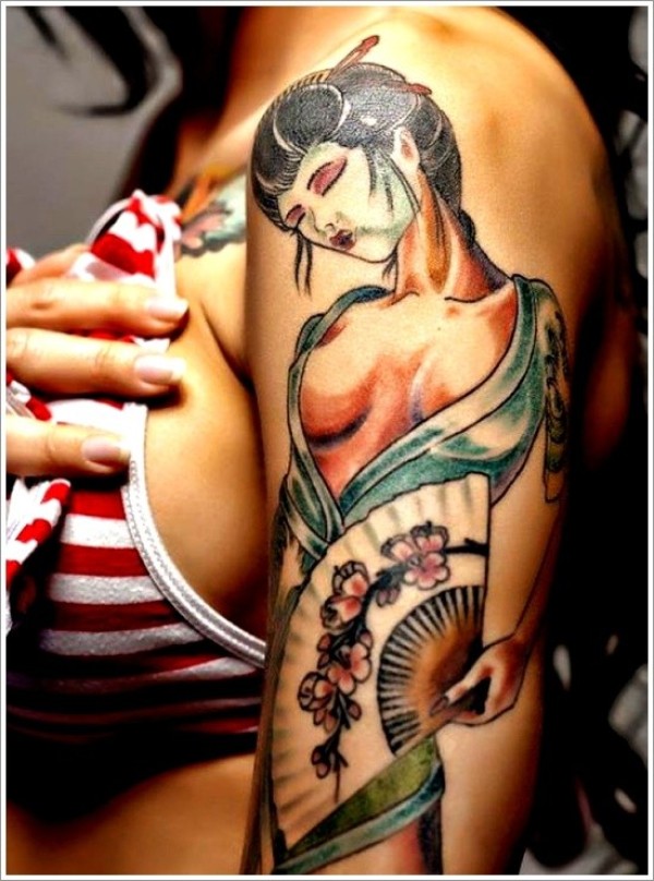 手臂亚洲风格的美丽诱人艺妓纹身图案