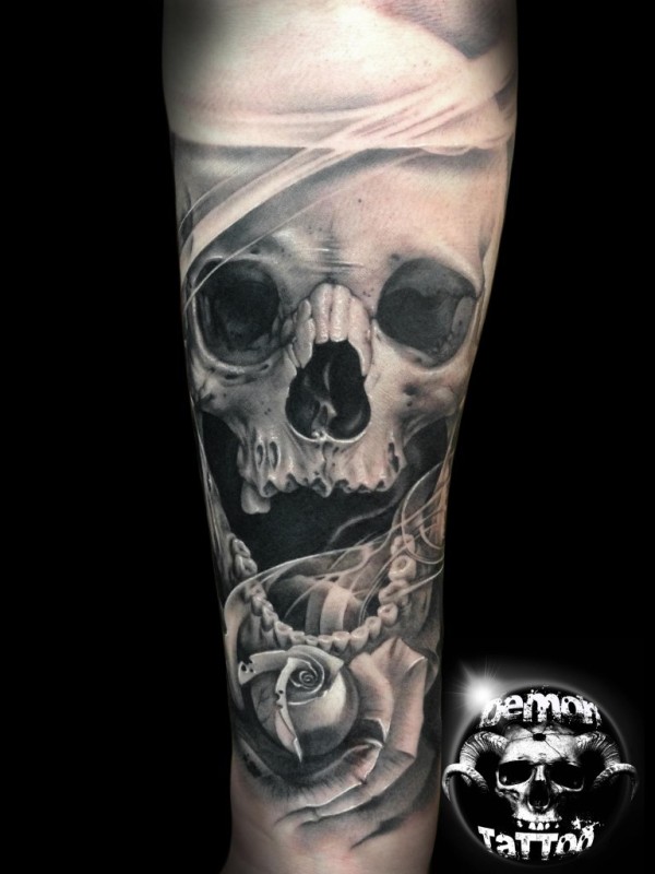 手臂令人印象深刻的逼真骷髅玫瑰纹身图案