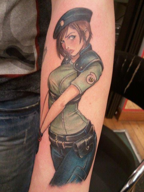 手臂卡通风格彩色的军事女生纹身图案