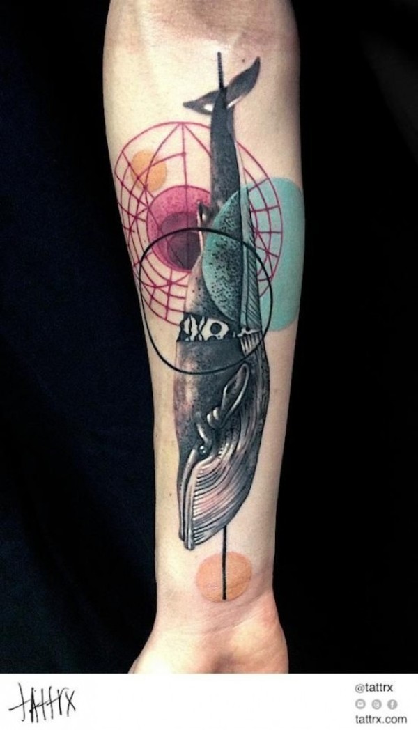 神秘的几何风格彩色大鲨鱼手臂纹身图案