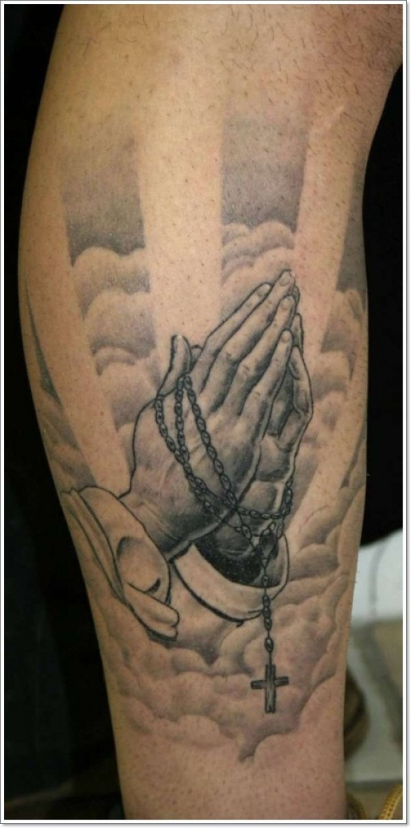 华丽的黑灰祈祷手和天空十字架手臂纹身图案