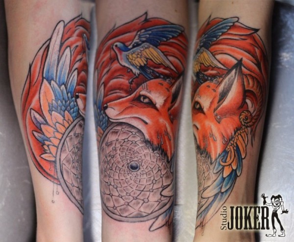 手臂绚丽的彩色捕梦网和狐狸小鸟纹身图案
