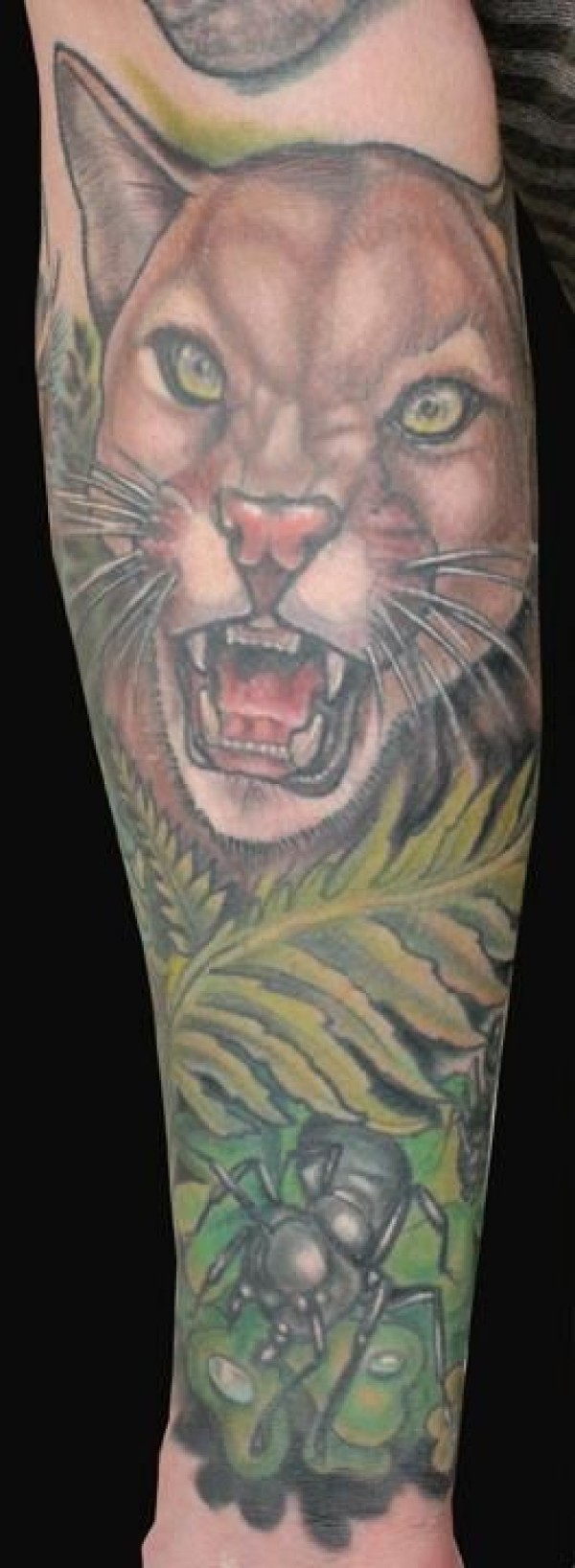 手臂很酷的的彩色邪恶咆哮野猫纹身图案