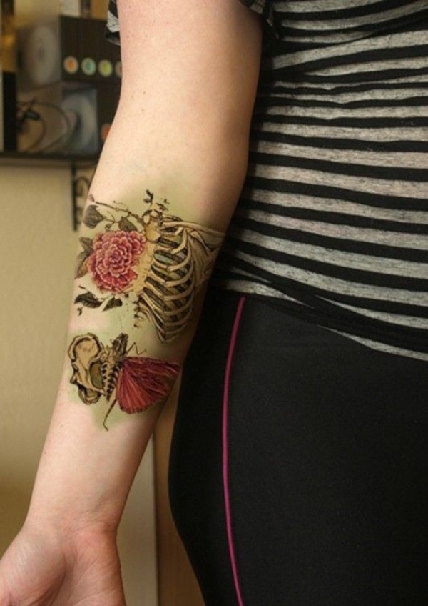 手臂有趣的彩色写实骨架与花朵纹身图案