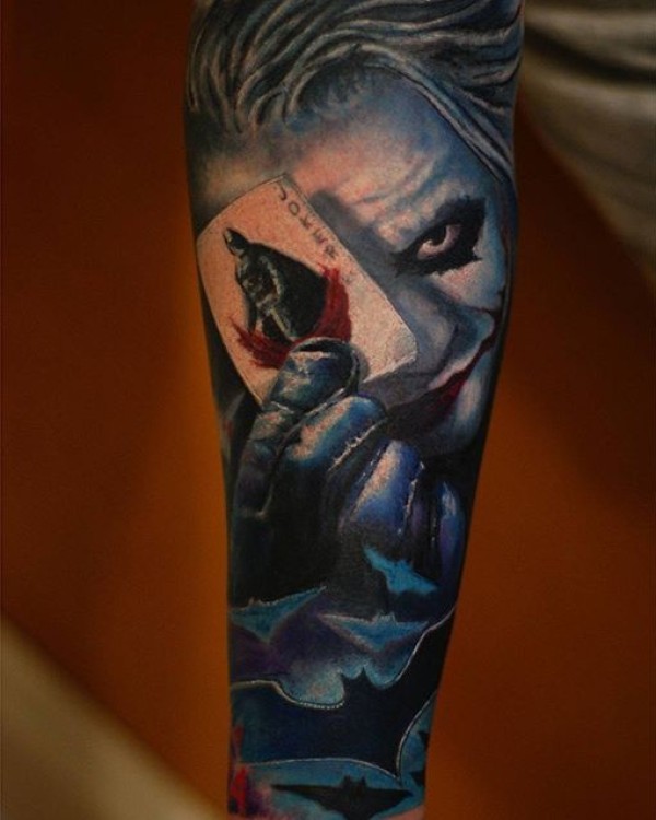 手臂可怕的写实小丑与蝙蝠侠卡片纹身图案