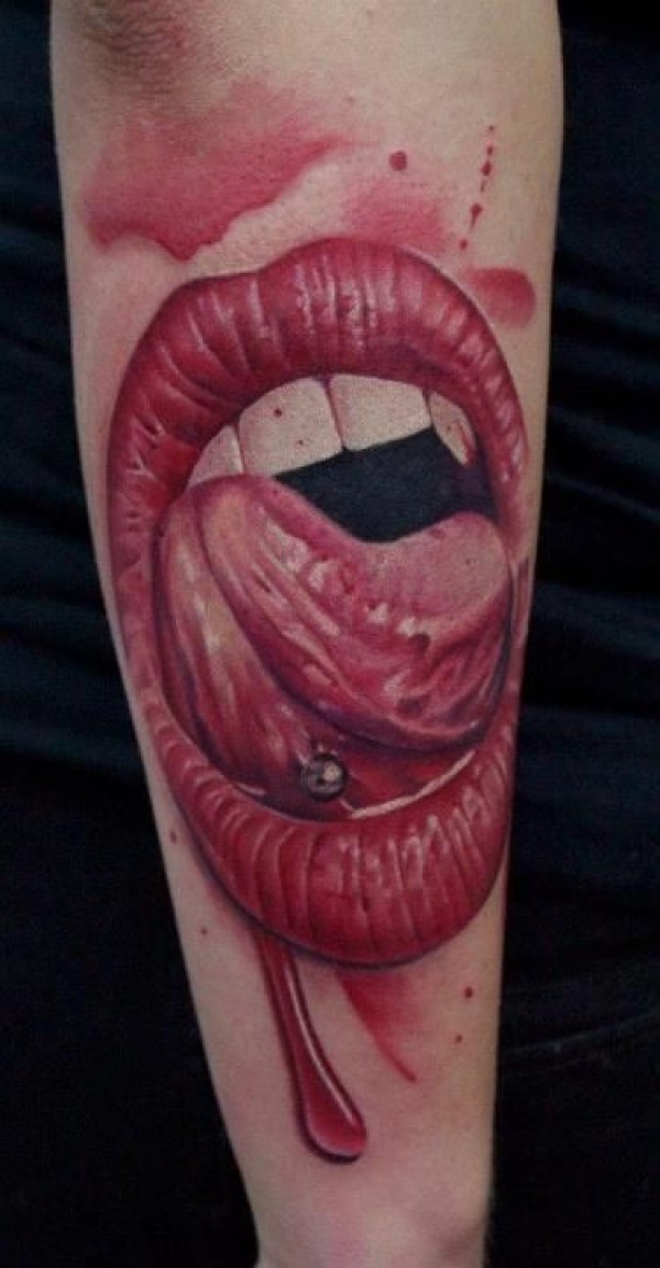 手臂可怕的彩色血腥嘴与舌头纹身图案