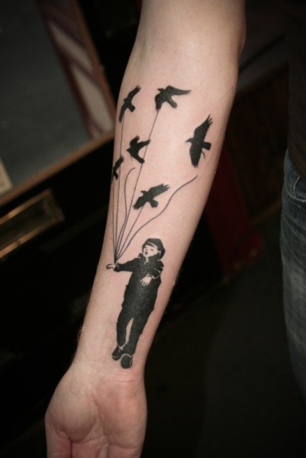 手臂令人印象深刻的黑色男孩与鸟形气球纹身图案