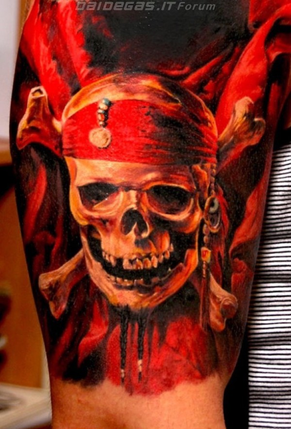 手臂非常逼真的彩色海盗骷髅标志纹身图案