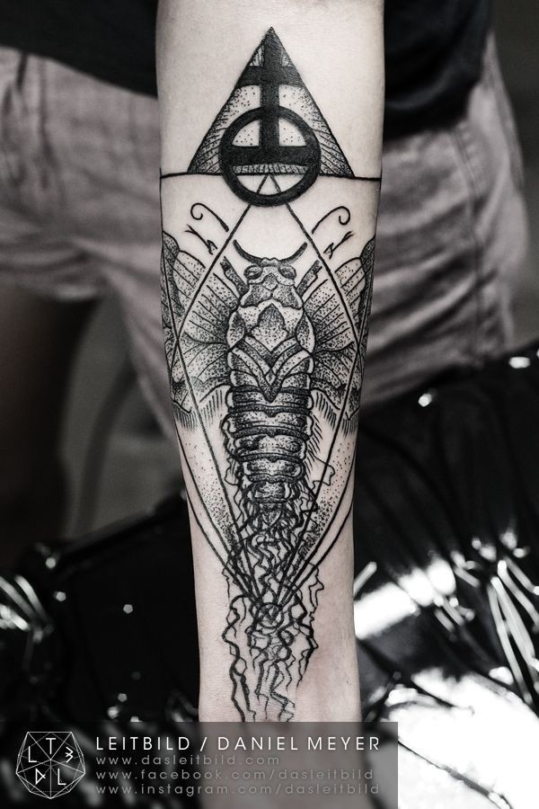 手臂黑色点刺的昆虫与符号纹身图案
