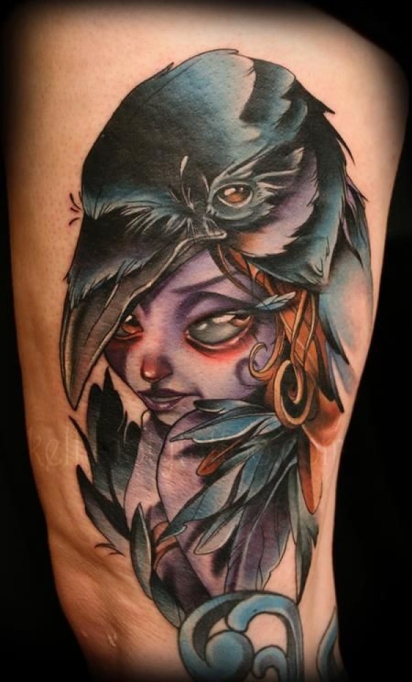 手臂美丽的卡通神秘女巫彩色纹身图案