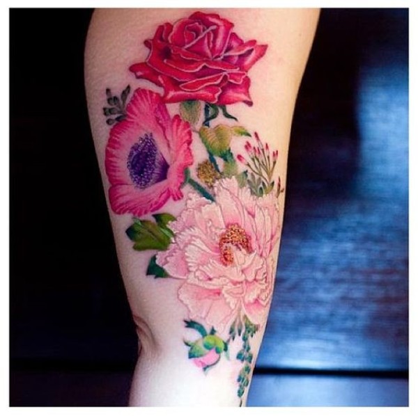 非常写实的五彩斑斓各种花朵手臂纹身图案