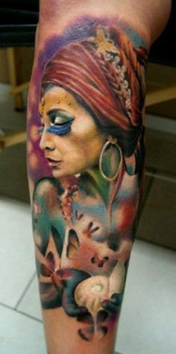 手臂写实风格的印度女性肖像彩绘纹身图案