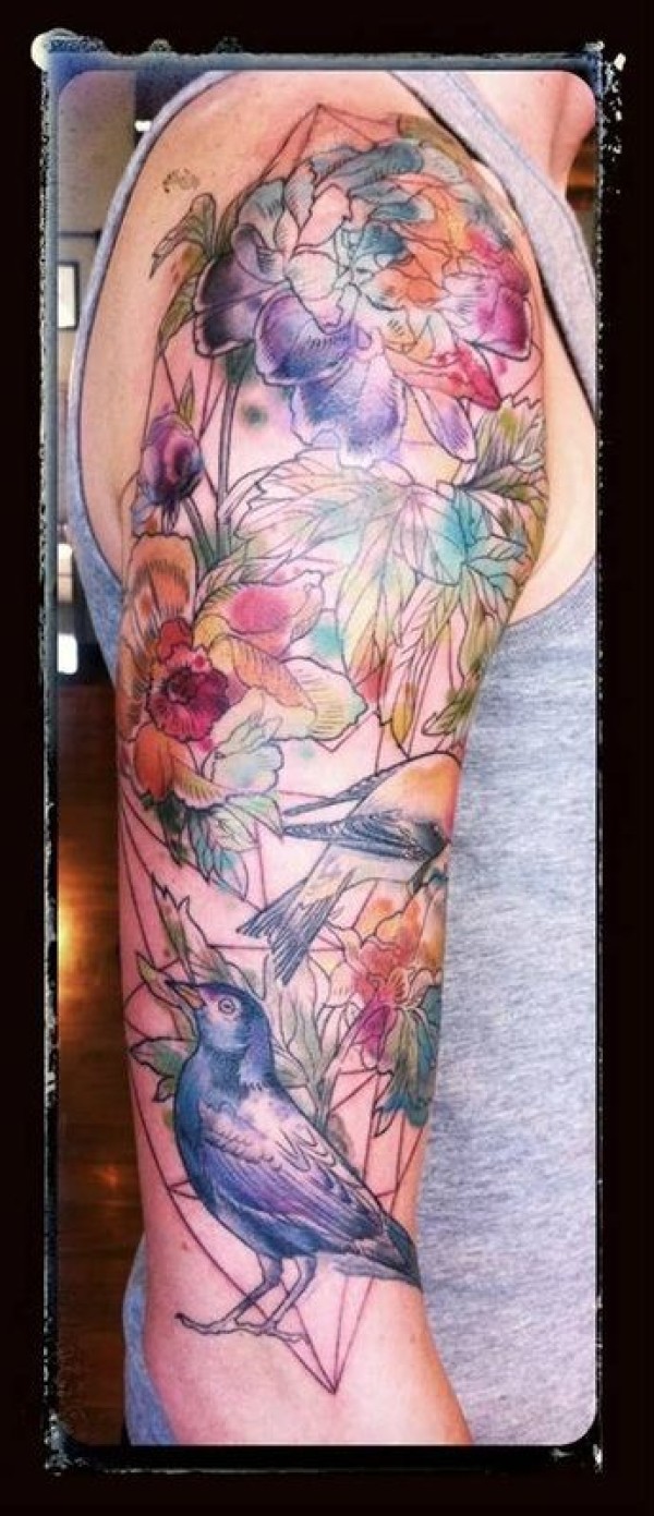 手臂美丽的七彩鸟类和花朵树叶纹身图案
