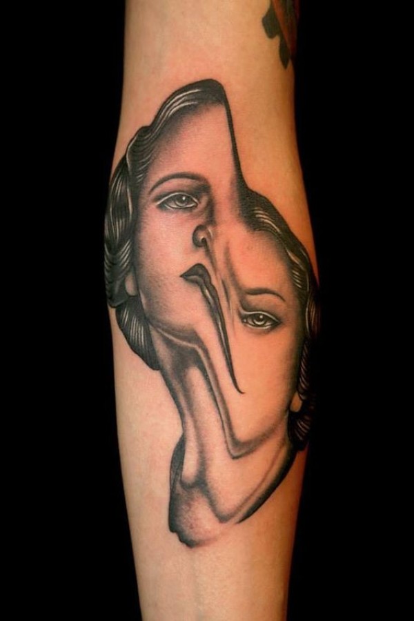 手臂独特的设计扭曲黑白女性肖像纹身图案