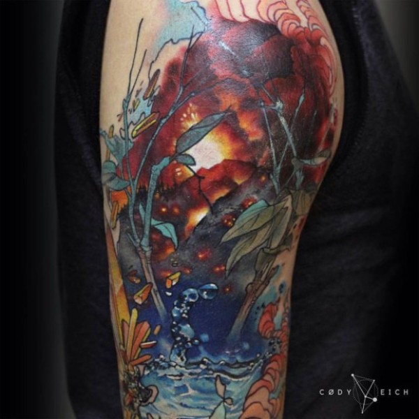 可怕的彩绘神秘夕阳植物手臂纹身图案