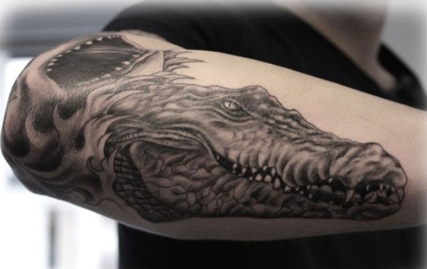 手臂黑灰惊人的鳄鱼头部纹身图案