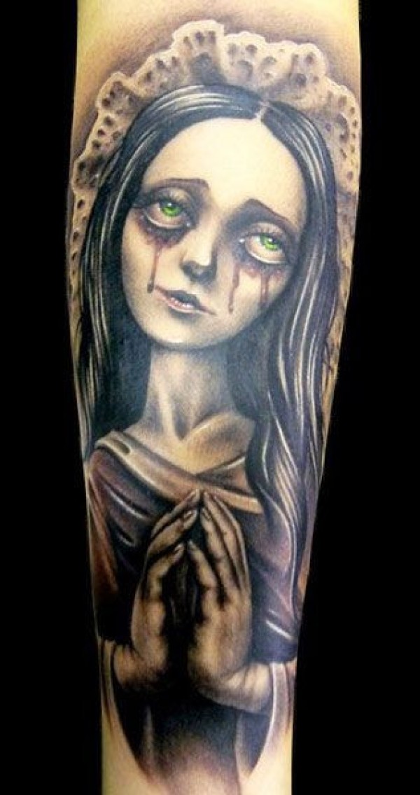 手臂哭泣的怪物女孩绿眼睛纹身图案