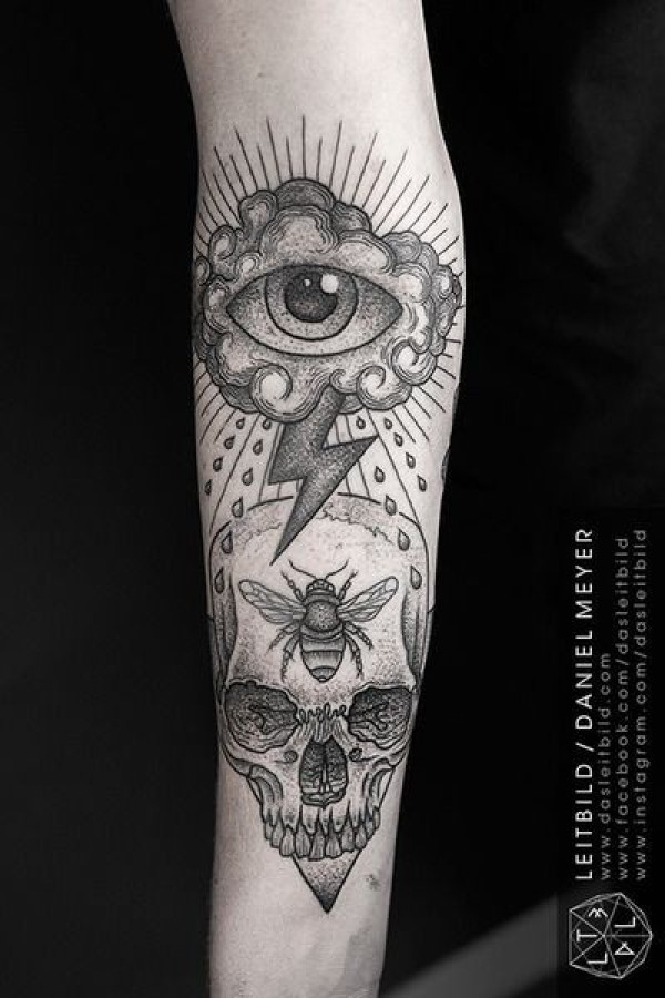 手臂不寻常的神秘眼睛和骷髅蜜蜂纹身图案