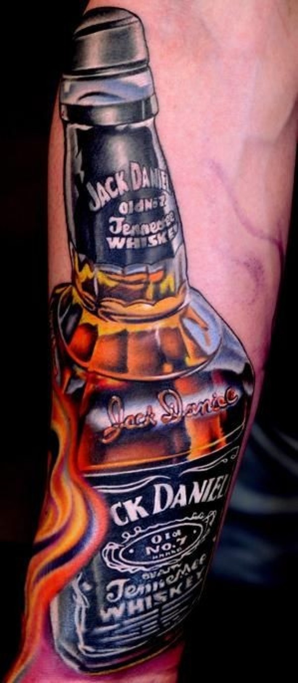 手臂非常逼真的五彩威士忌瓶子纹身图案