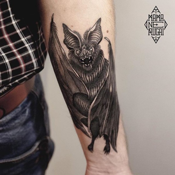 手臂现实的可怕黑白蝙蝠纹身图案