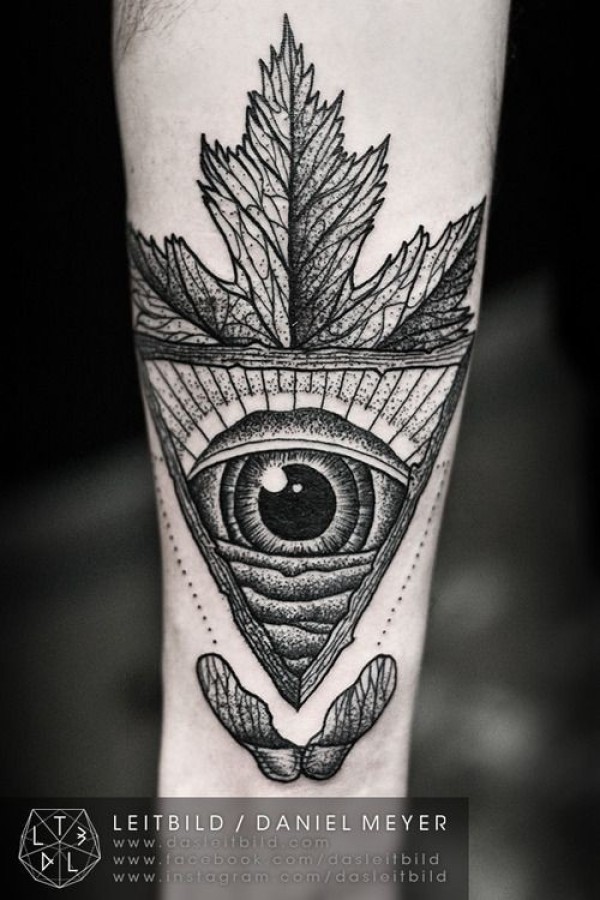 手臂黑白点刺风格的三角形眼睛纹身图案