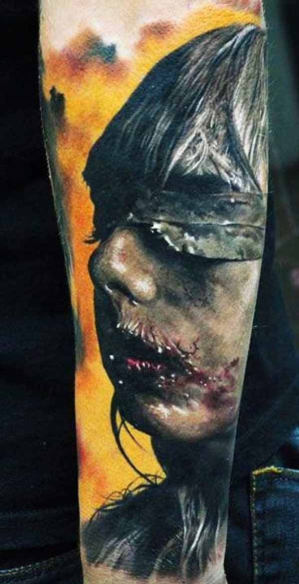 手臂毛骨悚然的血腥僵尸女性纹身图案