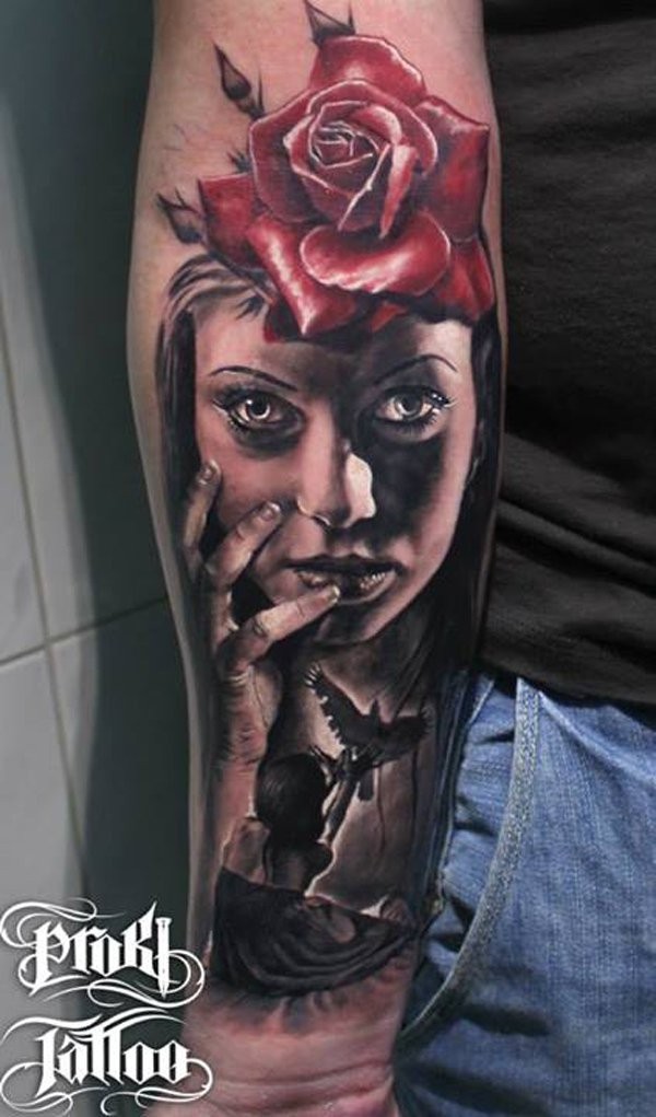 手臂令人毛骨悚然的逼真女子肖像与红色花卉纹身图案