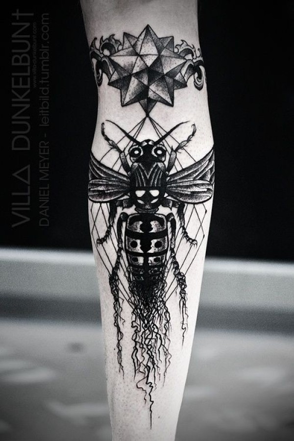 手臂精致的巨大黑白昆虫和星星纹身图案
