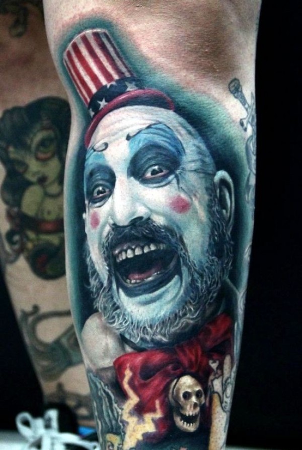 小腿恐怖风格的邪恶小丑肖像彩绘纹身图案