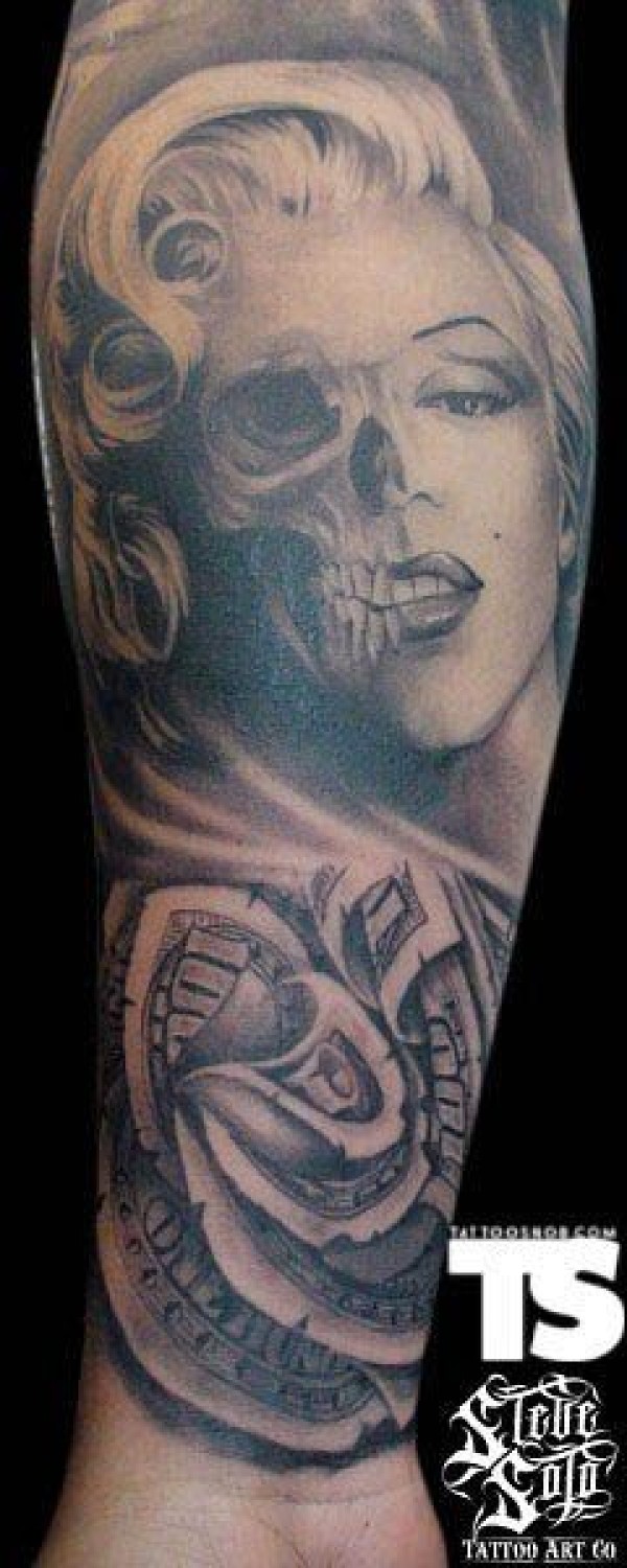 手臂难以置信的玛丽莲梦露肖像结合骷髅纹身图案