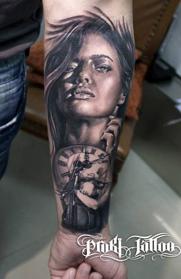 手臂黑白写实诱人的女人肖像与旧时钟纹身图案