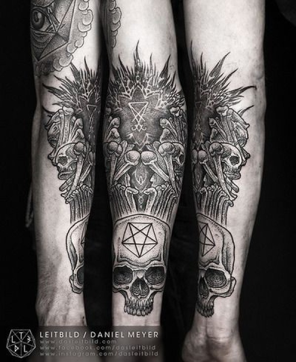 手臂非常精致的黑白骷髅五芒星纹身图案