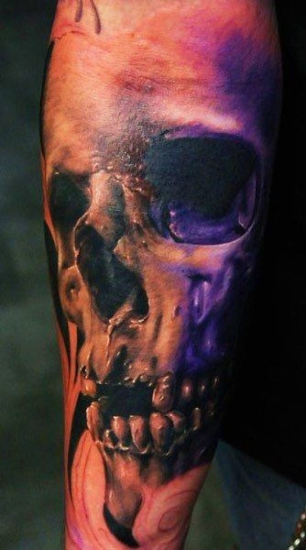 手臂恐怖风格的彩色骷髅纹身图案