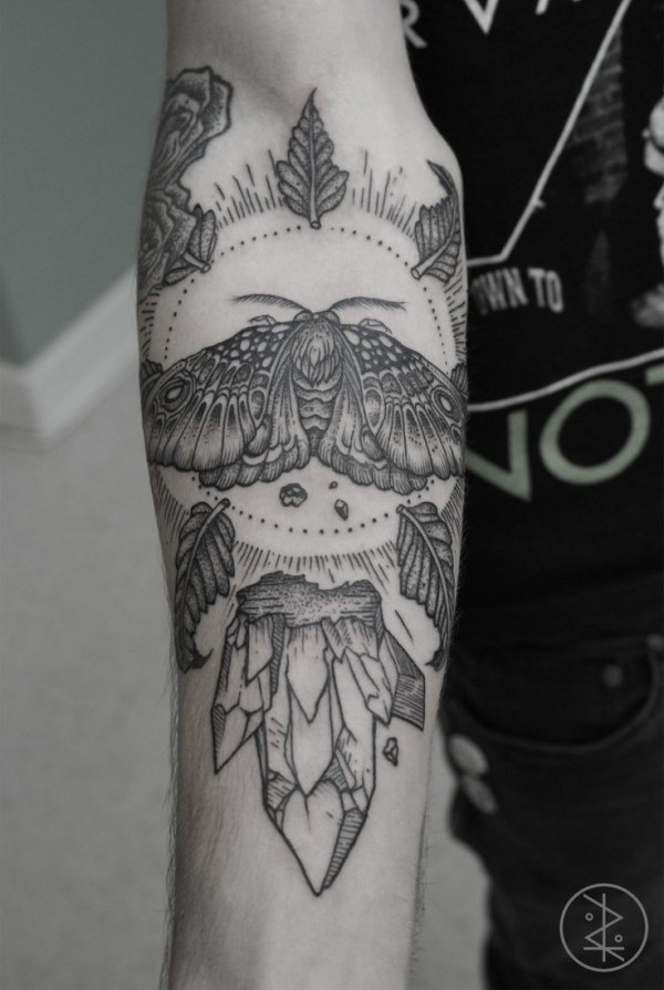手臂点刺黑白蝴蝶与树叶碎石纹身图案