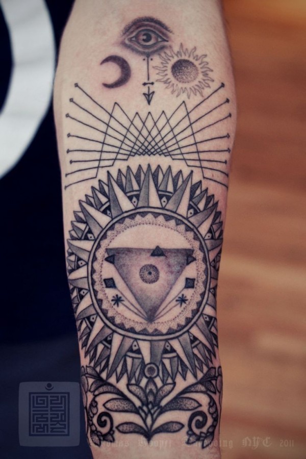 手臂惊人的神秘点刺几何太阳眼睛纹身图案