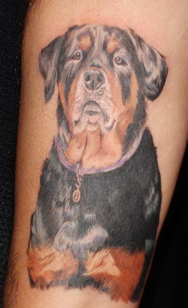 手臂丰富多彩的罗威纳犬纹身图案